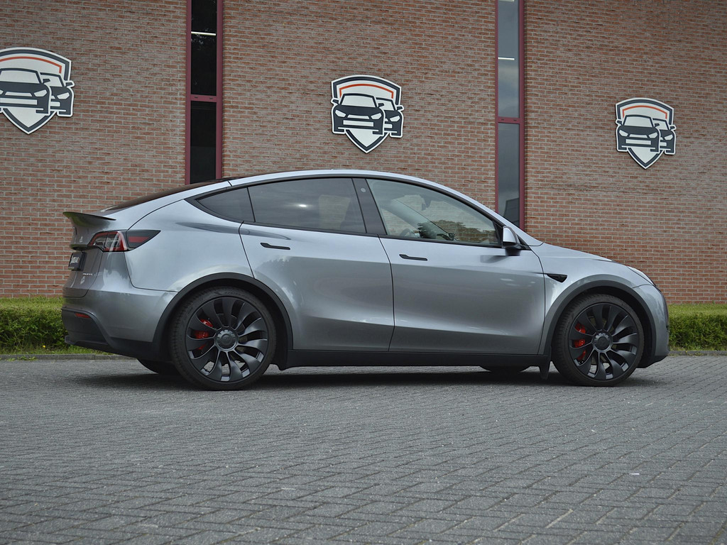 Rijklaarprijs. Tesla Model Y Performance (Dual Motor AWD) in Quicksilver, in combinatie met Premium interieur zwart.